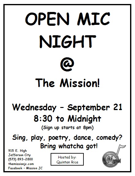 OPEN MIC NIGHT!! hosted by Quinten Rice BRING WHAT YA GOT! Music, dance, poetry, comedy; The Mission Stage is open. Sign up starts at 8pm and everybody gets 15 minutes so long as there is time. So come early and experience the best open mic night in town. Share this:Like this:Like Loading...