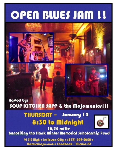 Blues Jam hosted by Soup Kitchen Sapp & Mojomanics 50/50 raffle! Pot will be split between the winner and the Hank Minter Memorial Scholarship Fund! Share this:Like this:Like Loading...