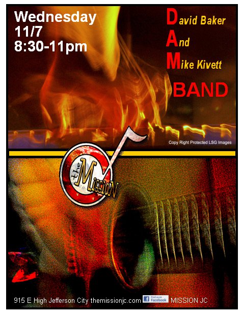 “If you find yourself with nothing to do this Wednesday, head to the Mission and check out The DaM Band! (Myself and the amazingly talented Michael Kivett) We will be playing hits from the 70’s, 80’s, 90’s and today! Once again, it is ‘Buy the Keyboard Player A Shot Night'”. – David Baker