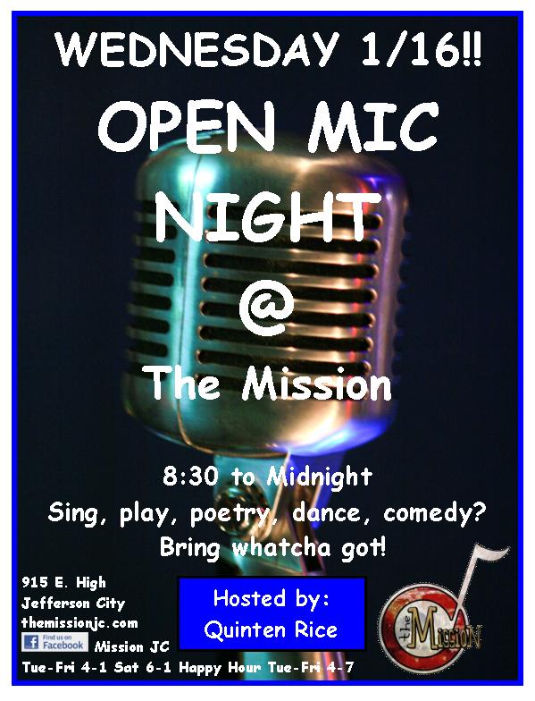 A TRUE Open Mic Night hosted by the best, Mr. Quinten Rice! Full backline provided; drums, bass, guitar AND amps. Just show up and show us whatcha got! Sing, play, poetry, dance, comedy…The Mission stage is open. Sign up starts at 8:00pm with 15 minutes for each act. Jam to follow provided time allows.